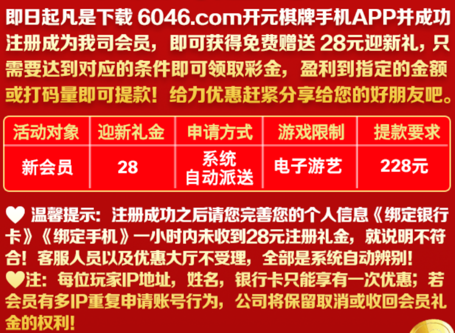 活动详情:新用户注册绑定手机号,银行卡一小时内自动送28彩金。