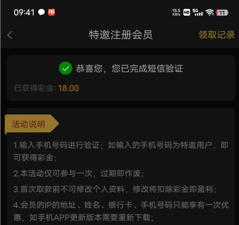 活动详情:刚刚有个老哥发的电话彩金没链接,我去找了下发现没注册。下载APP绑卡直接领,我也不是特邀。现在人少速冲,我还没打,出款不清楚。别充值
